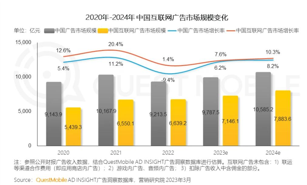 同样来自Questmobile的报告指出,2022年互联网广告市场规模为6600亿元,同比增幅仅为1.4%。细分数据则显示,电商、短视频是广告规模最大的两个行业,可惜增速也在下滑。