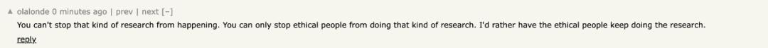在 Hacker News 上看到这样一句话,“你无法阻止此类研究的发生。你只能阻止有道德的人做那种研究。我宁愿让有道德的人继续去做这些研究。”