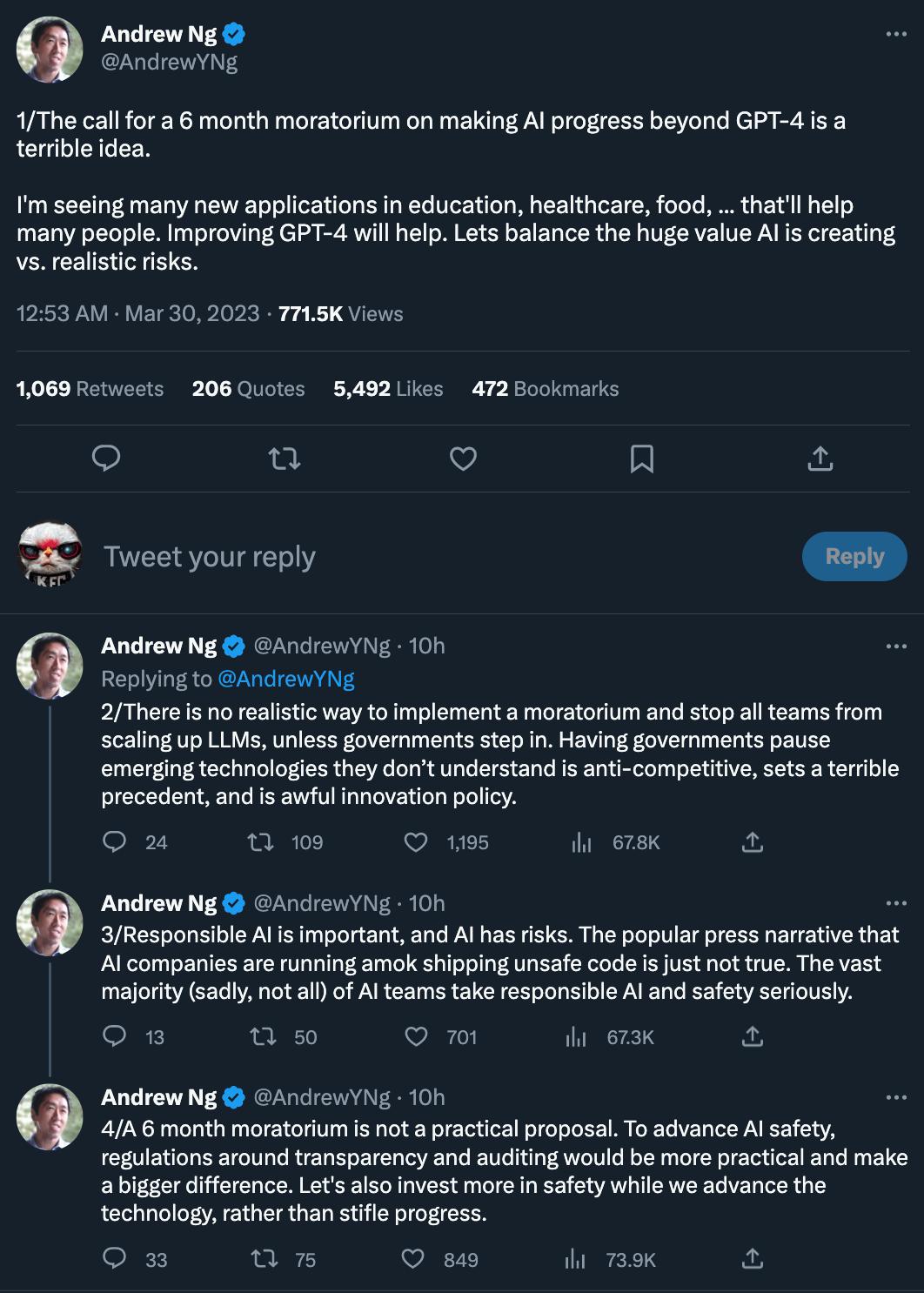 同时,吴恩达表示,除非政府介入,否则没有现实的方法来实施暂停并阻止所有团队扩大 LLMs 的规模。让政府暂停他们不了解的新兴技术是反竞争的,这会树立一个可怕的先例,是可怕的创新政策。