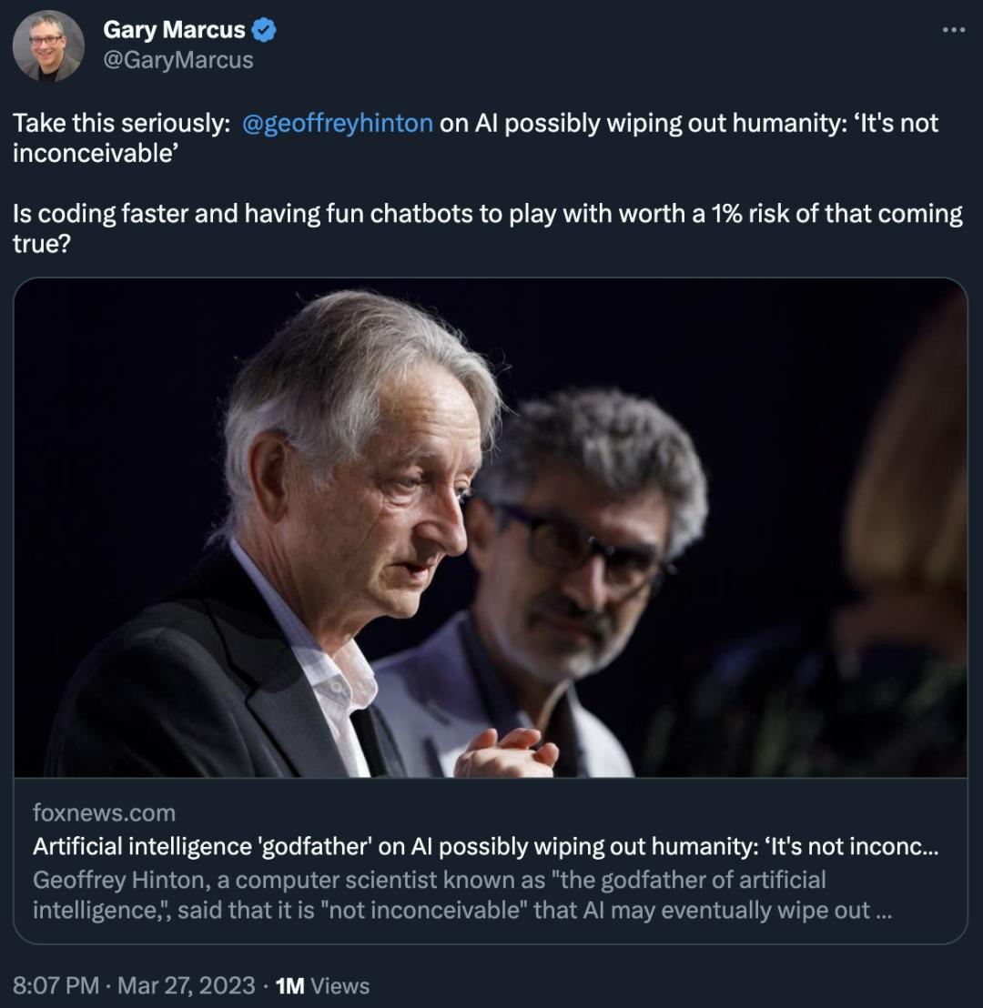 自从我发布了这些推文后,我就一直受到反击和质疑。一些人认为我误解了 Hinton 的说法(鉴于我的独立来源,我很确定我没有);另一些人则抱怨我关注了一系列错误的风险(要么过于关注短期的,要么过于关注长期的)。