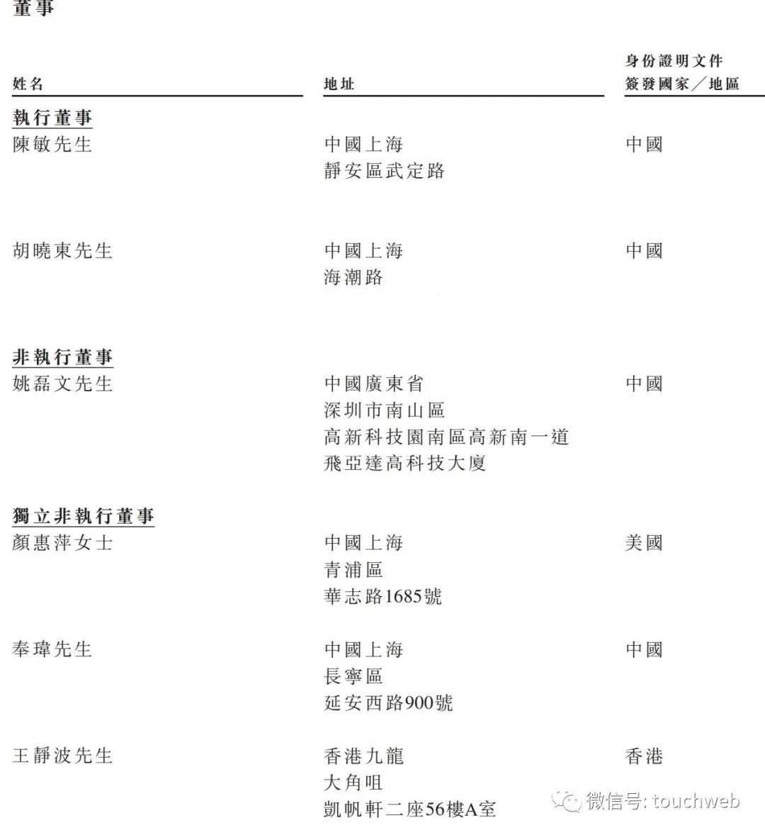 途虎养车的执行董事为陈敏、胡晓东;非执行董事为姚磊文,独立非执行董事为颜惠萍女士、奉玮、王静波。