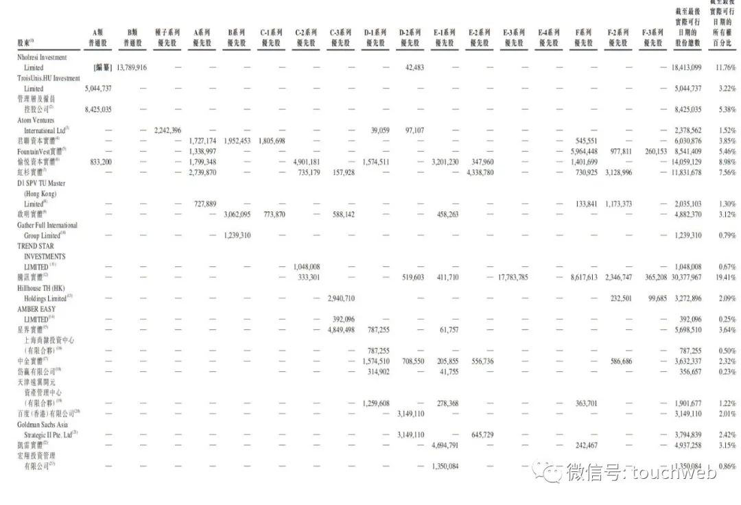 IPO前,陈敏持股为11.76%,胡晓东持股为3.22%,腾讯持股为19.41%,愉悦资本持股为8.98%,红杉中国持股为7.56%,FountainVest持股为5.46%。百度持股为2%,中金持股为2.32%。
