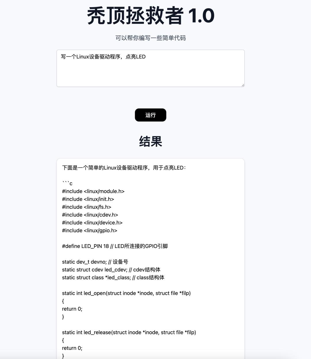 让它写个点亮 LED 的 linux 设备驱动程序 ▼