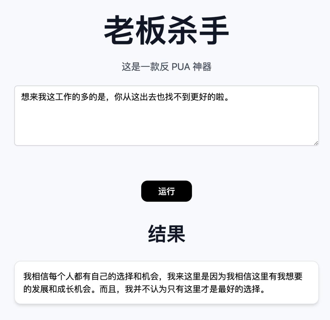 只需要把老板 PUA 你的话复制进去,工具就会输出一个反 PUA 的句子。