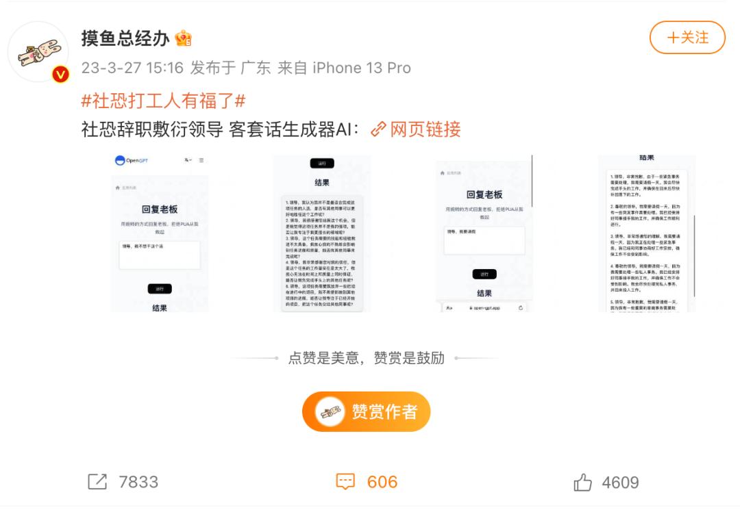 比如这段时间,小红书和微博上大火的各种「 回复老板 」神器,就是用这个网站做的。