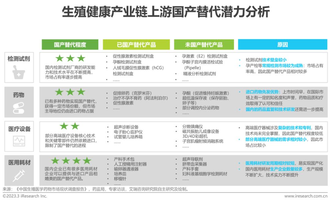 生殖健康产业上游主要由检验试剂、药物、医疗设备和耗材构成,整体市场环境呈现出国际品牌竞争优势明显,国产品牌持续渗透的局面。目前部分生殖健康领域药物、高精尖医疗器械仍然依赖进口。检测试剂和医用耗材的国产替代程度要高于药物和医疗设备,技术壁垒不高,研发周期可控,申请二类医疗器械注册证即可上市等因素,促使这类产品能够快速在市场流通,从而占领市场份额。因此在政策和行业环境推动下,国产替代仍然是产业链上游的主流特征。