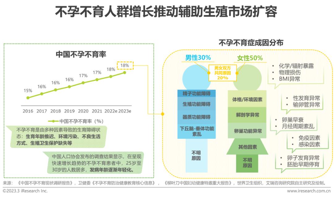根据世界卫生组织(WHO)定义:不孕不育症是指育龄夫妇一年以上性生活正常且未采取任何避孕措施,但没有成功妊娠,即为不孕不育症。不孕不育病症成因可能来自不良生活习惯和生殖系统功能异常等问题,其中染色体异常等遗传因素逐步受到医患重视,患者就诊意识加强和晚婚晚育的趋势促使我国不孕不育率逐年攀升。根据《柳叶刀中国妇幼健康特邀重大报告》预测数据,2023年我国不孕率预计将达到18.2% 。不孕不育率的快速上升意味着辅助生殖服务潜在需求人数增长,从而驱动辅助生殖市场扩容。