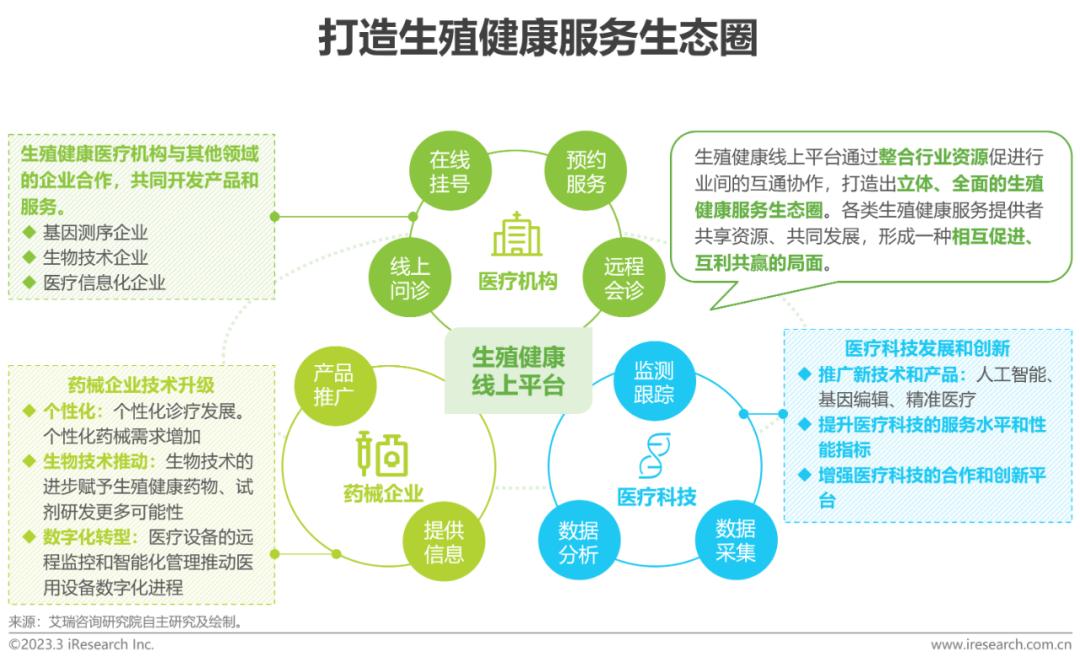 人工智能、基因编辑、精准医疗等新技术和产品为生殖健康产业链上游发展注入新的活力;生殖健康产业链中游医疗机构与其他领域的机构合作,加速医疗机构智能化和精准化发展趋势,生殖健康线上平台整合行业资源,打造全新的生殖健康服务生态圈。行业生态的构建有效地提升了生殖健康服务的质量和效果,为用户提供更加全面、精准、个性化的生殖健康服务,有助于提高行业的整体服务水平和竞争力,推动生殖健康行业的演化与升级。