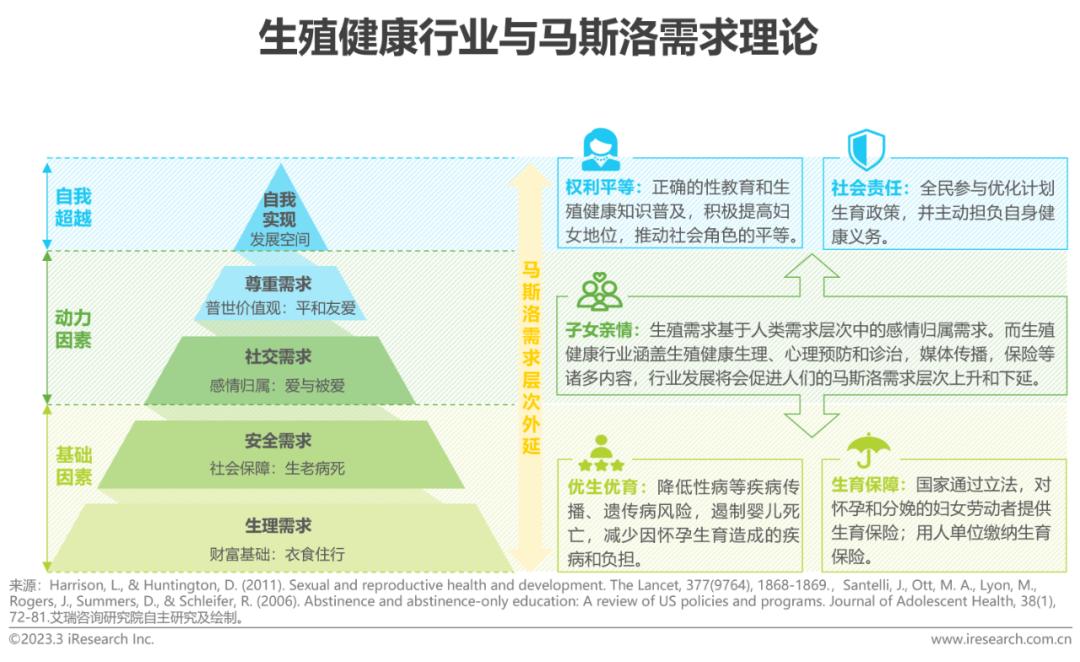 马斯洛需求理论为生殖健康需求提供了理论支持,这些需求包括对安全、爱与归属、尊重和自我实现的需求。如果一个人不能满足基本的生理和安全需求,就难以追求更高层次的需求,因此,满足生殖健康需求可以促进人们向更高层次的需求发展。生殖健康行业发展带来的优生优育、生育保障、权利平等、健康义务等影响使得人类需求层级不断外延。当今生殖健康行业发展,全民生殖健康水平已经成为评价一个国家社会文明进步程度的重要指标。因此生殖健康行业与我国民生大计息息相关。