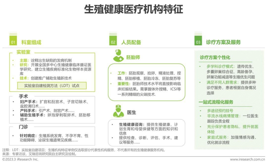 生殖健康实验室的设立以国家人口健康重大需求为导向,为提高我国生殖健康水平和出生人口质量提供了有力支撑,其中LDT试点工程将有效推动生殖健康机构朝着精准化诊疗发展;在生殖健康医疗机构人员配备方面,以辅助生殖为例,胚胎师主要负责胚胎培养,医生主要负责提供诊疗方案,二者都是诊疗过程的重要组成部分;生殖健康作为一个敏感领域,客户对医疗服务和产品的需求较高,中游生殖健康医疗机构注重服务质量和客户体验,建立了完善的服务流程和管理体系。
