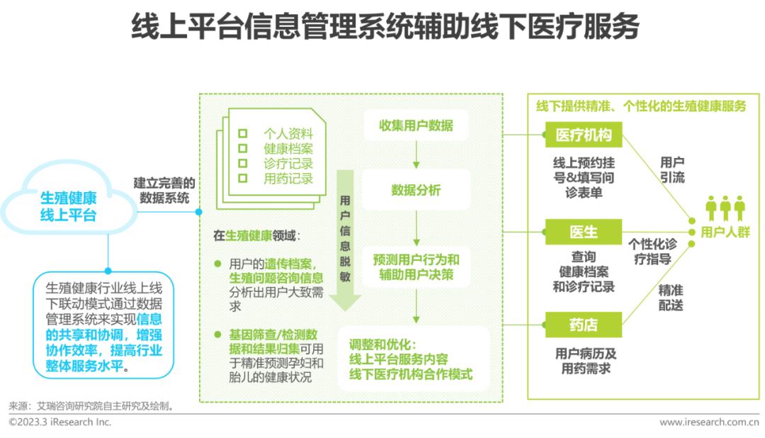 生殖健康平台的涌现,旨在提高医疗资源利用率,减少冗余投入,提升医疗服务水平。生殖健康线上平台的线上线下联动和信息管理系统密不可分,当生殖健康线上平台建立完善的信息管理系统后,可以通过数据分析和了解用户需求,及时调整和优化线上服务内容和线下医疗机构合作模式,进一步提升用户体验和满意度。平台能够实时掌握线上用户的需求和行为,为线下医疗机构提供更精准的用户引流和诊疗指导;同时,线下医疗机构的诊疗数据也可以汇总到数据管理系统中,以便线上平台提供更全面的健康管理服务。线上线下联动的模式能够通过数据管理系统来实现信息的共享和协调,增强协作效率,提高行业整体服务水平。