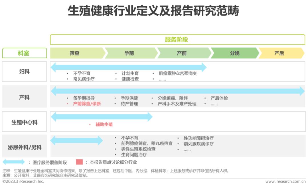 党中央、国务院发布《“健康中国2030”规划纲要》,提出了健康中国建设的目标和任务,明确指出要加强出生缺陷综合防治,构建覆盖城乡居民,涵盖孕前、孕期、出生等各阶段的出生缺陷防治体系。生殖健康行业良性发展满足人民日益增长的优生优育需求。生殖健康行业指包括筛查、孕前、产前、分娩、产后生殖过程的一系列医疗服务和诊治手段,根据医疗服务机构科室划分,覆盖育龄人群的所有生殖阶段。其中辅助生殖行业和产前筛查/诊断行业是本次报告重点讨论内容。
