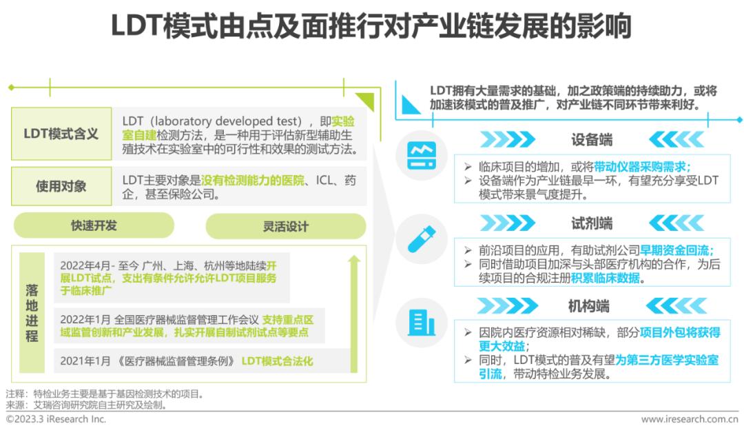 在生殖健康行业发展过程中,LDT模式以其快速开发、灵活设计等特点,成为行业不断革新的推动力。然而我国LDT在政策监管、项目规模和应用普及等方面均与欧美发达国家存在差距,无法满足国内医疗发展的迫切需求。因此,强调进一步加速推进由点及面的LDT试点尤为关键。2023年全国两会着重提及将加快LDT规范化建设管理,这无疑为生殖健康行业提供利好信号,可以预见2023年LDT试点工作将有重大进步。LDT模式的试点推进将进一步利好生殖健康项目落地,缓解服务机构资源稀缺,进一步推动设备、试剂及机构端的向前发展。