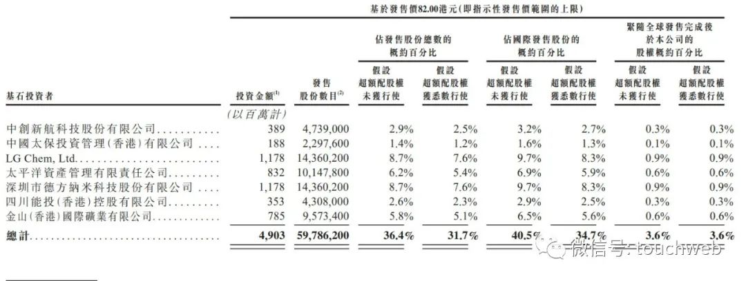 上述基石投资者一共认购49亿港元,其中,中创新航科技股份有限公司认购3.89亿港元,中国太保投资管理(香港)有限公司认购1.88亿港元,LG Chem认购11.78亿港元,太平洋资产管理有限责任公司认购8.32亿港元,深圳市德方纳米科技股份有限公司认购11.78亿港元,四川能投(香港)控股有限公司认购3.53亿港元,金山(香港)国际矿业有限公司认购7.85亿港元。