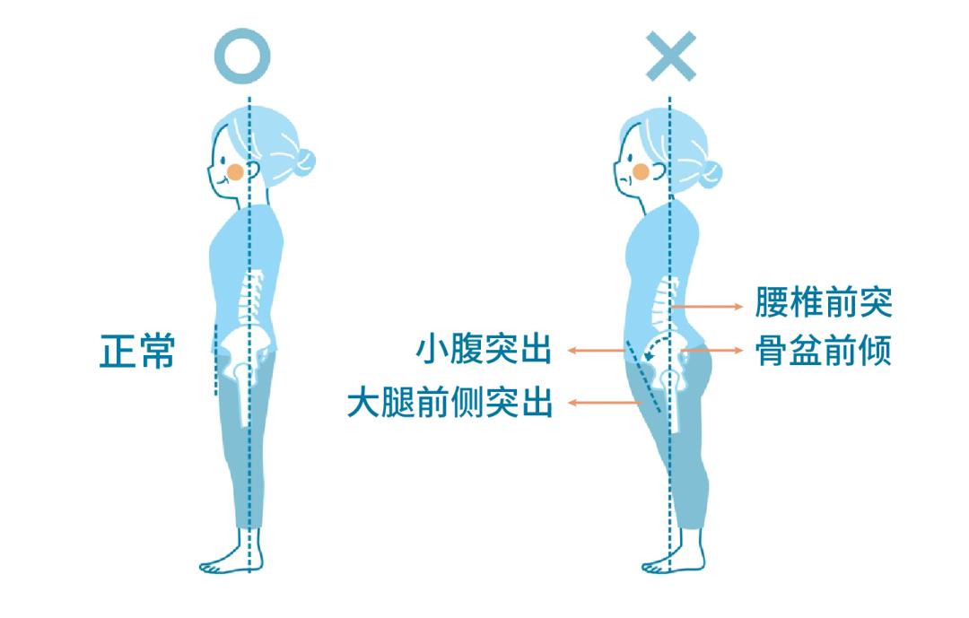 久而久之,身体前后侧肌肉力量会越来越不均匀。骨盆在前侧紧张肌肉的牵拉下,会过度前倾,腰椎也会前突而受到挤压。