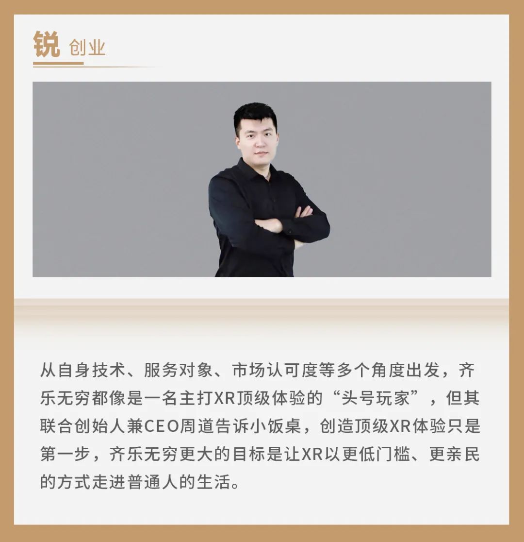作为当红齐天集团旗下子公司,从各个角度看,齐乐无穷都像是一名主打XR顶级体验的“头号玩家”,但齐乐无穷联合创始人兼CEO周道告诉小饭桌,创造顶级XR体验只是第一步,齐乐无穷更大的目标是让XR以更低门槛、更亲民的方式走进普通人的生活。