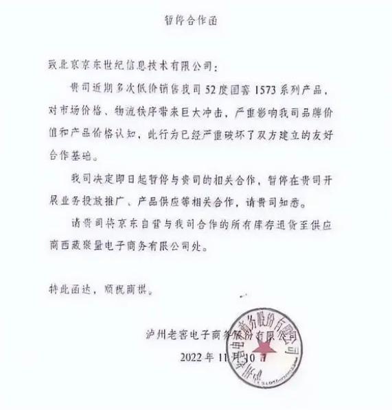比如去年泸州老窖旗下泸州老窖电子商务有限公司对外发布和京东的暂停合作函,指责京东存在低价倾销的行为。事实上,泸州老窖电子商务有限公司的指责并非空穴来风。泸州老窖旗下大单品52度国窖的市场批发参考价在905元左右,单瓶厂商指导价为1499元。但在去年11月14日,泸州老窖官方京东自营旗舰店该款白酒的预估到手价为1139元/瓶,叠加优惠最低到手价为908元/瓶,这一价格直逼市场批发参考价。显然扰乱了商家自有的定价体系。