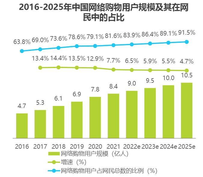 一组值得关注的数据是截至2021年底,国内网购用户规模达8.4亿,占国内网民总数的81.6%,这一数字实则已经触及到当前国内网购用户增长的天花板。