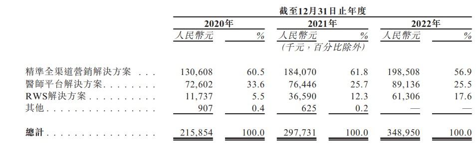 招股书显示,2020年-2022年,梅斯的收益分别为2.16亿元、2.98亿元、3.49亿元,其中来自精准全渠道营销解决方案的收入分别为1.31亿元,1.84亿元及1.99亿元,占比分别为60.5%、61.8%及56.9%,是公司第一大业务。