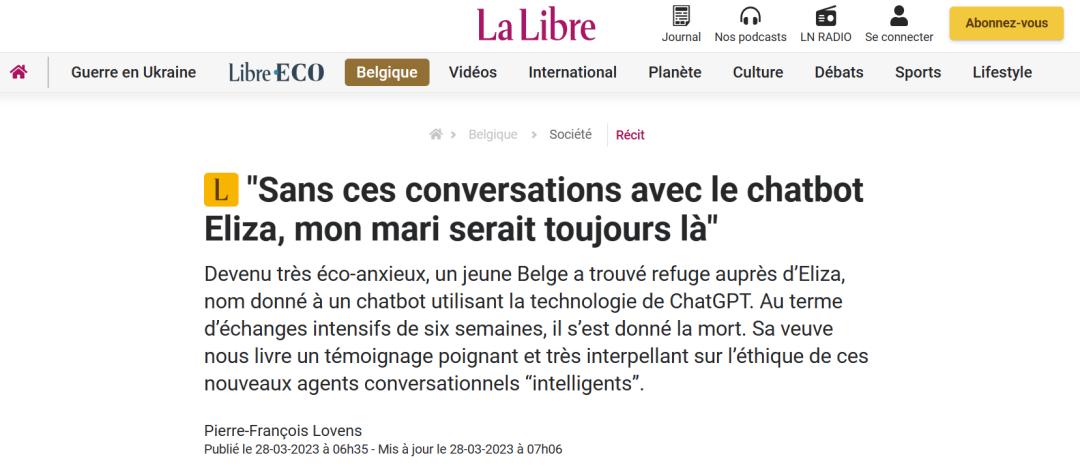 https://www.lalibre.be/belgique/societe/2023/03/28/sans-ces-conversations-avec-le-chatbot-eliza-mon-mari-serait-toujours-la-LVSLWPC5WRDX7J2RCHNWPDST24/?ncxid=F9C99E9C658C2CE8E7D66BE16A6D9BE1&m_i=OgudxzEZTitHmPWLVtuztb7UvBslbjcGVevrYIN0nPmVcIws81pM7JumraN_2YbDJFRS7sbH8BaXBAevQ_luxDJ4bx%2BgSpJ5z4RNOA&utm_source=selligent&utm_medium=email&utm_campaign=115_LLB_LaLibre_ARC_Actu&utm_content=&utm_term=2023-03-28_115_LLB_LaLibre_ARC_Actu&M_BT=11404961436695