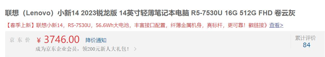 比如联想主打中低端市场的小新系列,今年新推出的小新14 2023锐龙版,搭载了锐龙5 7530U处理器,16GB内存和512GB固态硬盘,16:10的1920*1200屏幕,一体化金属机身,重量1.46KG,厚度为16.9mm,支持65W PD快充。