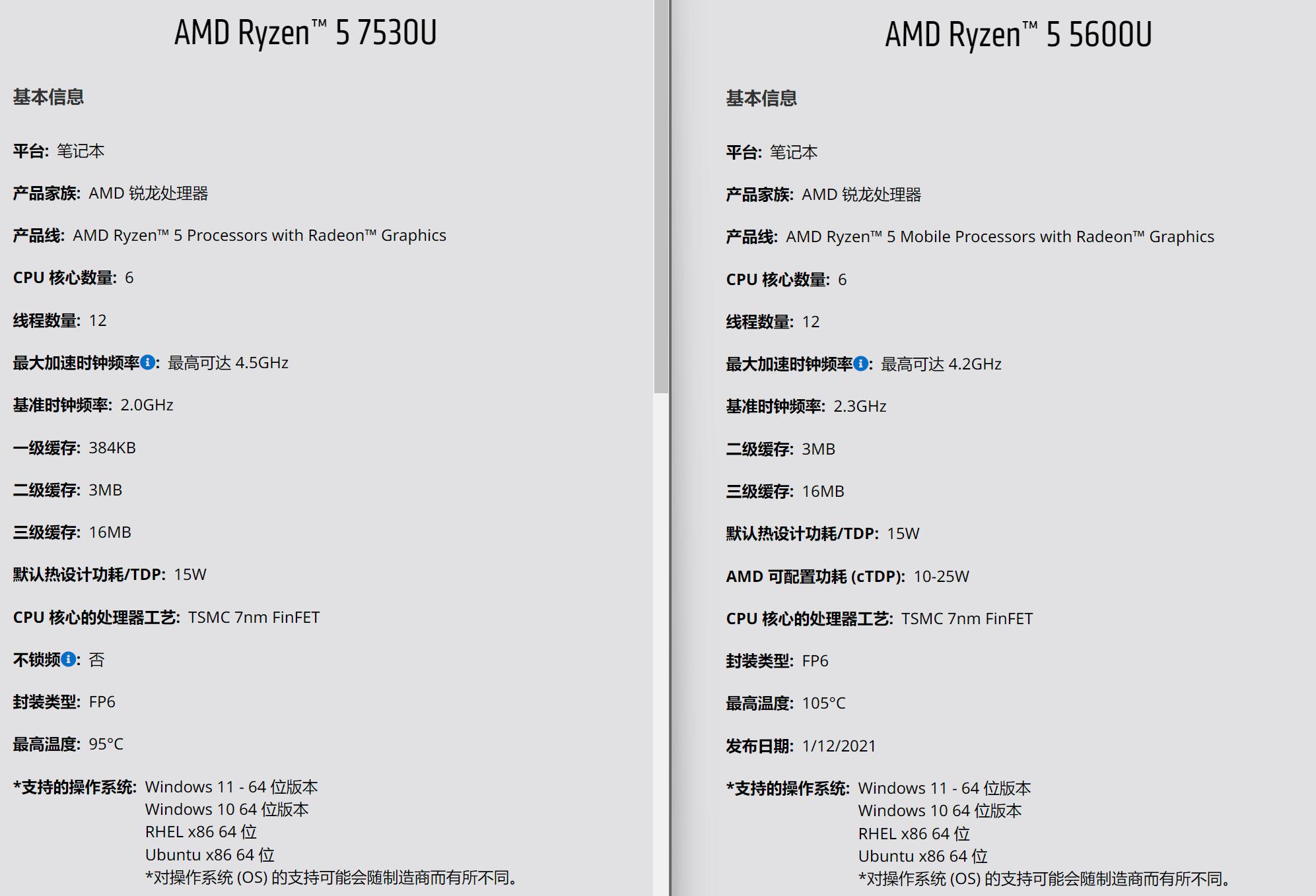 以我们刚刚介绍过的几款锐龙笔记本电脑来说,我们可以看到基本上都配置的锐龙5 7530U或7520U两款处理器,虽然型号上看是最新的锐龙7000系处理器,实际上从参数表现和架构来看,基本上可以确定是锐龙5 5600U的超频版。