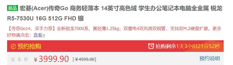 无独有偶,老牌厂商宏碁也推出了一款类似配置的产品,同样的锐龙5 7000系列处理器、同样的金属机身,甚至重量更低、更薄,售价则是3999元。