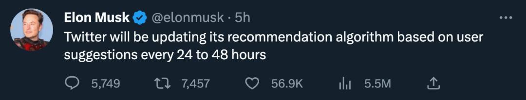 既然开源,那就表示接受修改建议。马斯克又表示了,每过 24 小时到 48 小时,推特会根据用户建议对推荐算法进行一次更新。