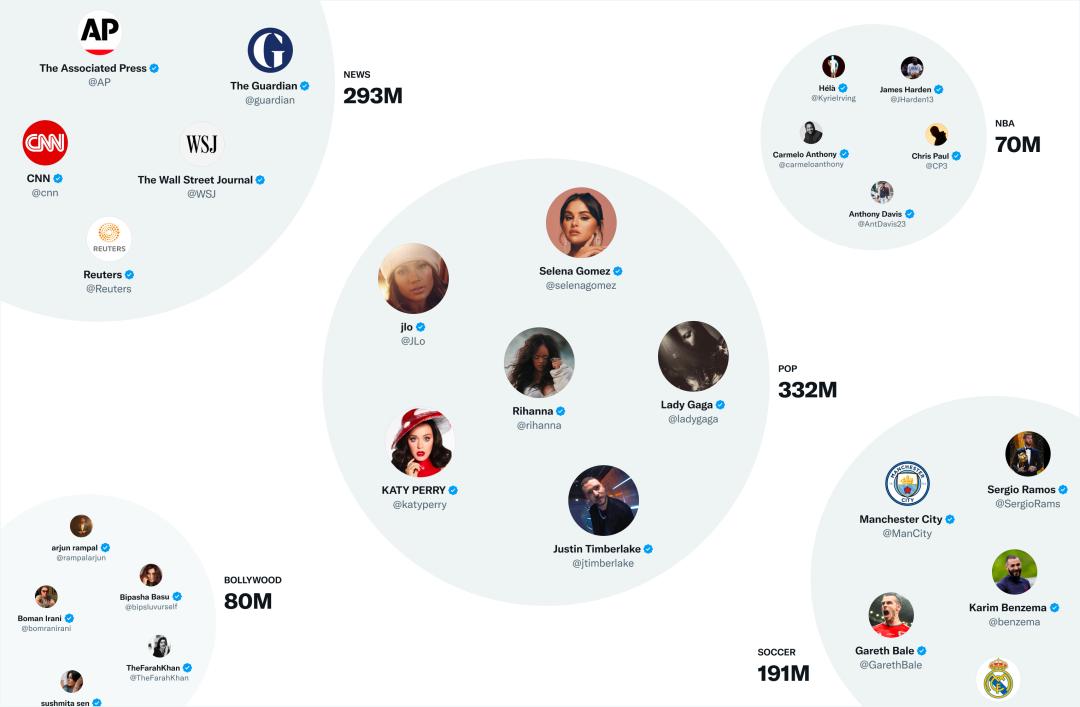 推特最有用的嵌入空间之一是 SimClusters。SimClusters 使用自定义的矩阵因子化算法,发现由有影响力的用户集群锚定的社区。这里有 14.5 万个社区,每三周更新一次。用户和推特在社区的空间中被表示出来,并且可以属于多个社区。社区的规模从个人朋友圈的几千个用户到新闻或流行文化的几亿个用户不等。这些是一些最大的社区: