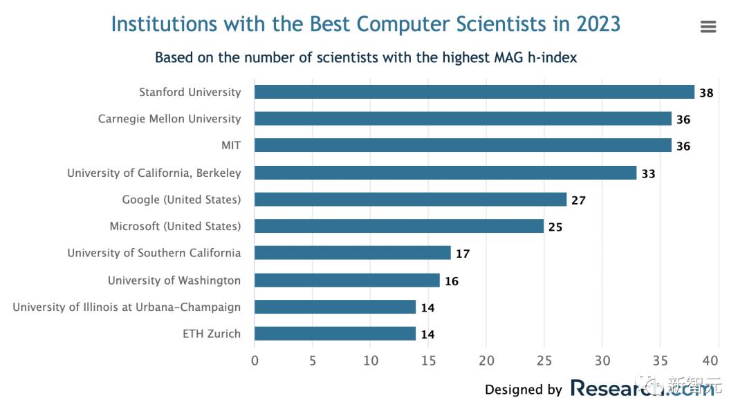 在2023年的排名报告中,斯坦福大学的顶尖计算机科学家数量跃居榜首,共有38名计算机科学家。