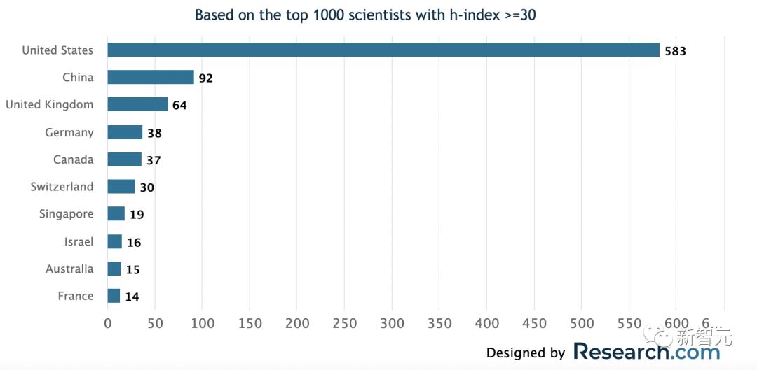 与此同时,中国和英国也保持了去年的第2名和第3名的位置,分别有96名和64名科学家,占比为9.2%和6.4%。