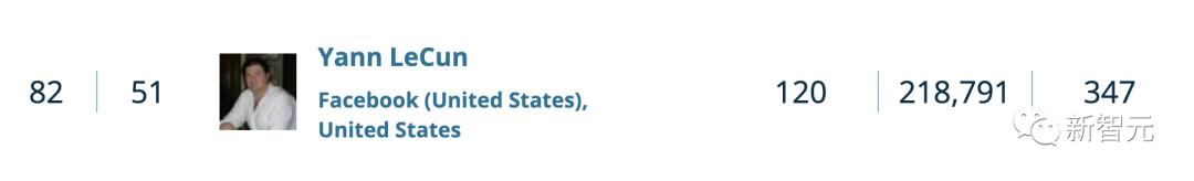 此外,在本次榜单中,LeCun以120的D指数世界排名第82。