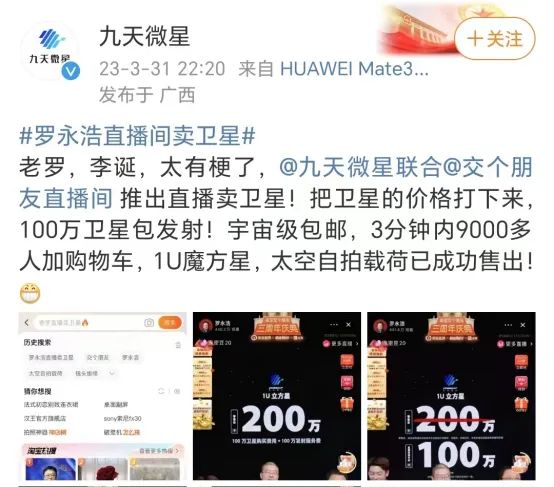几天的造势过后,3月31日晚,“罗永浩”淘宝直播间正式上架了几款价值从200万-3000万不等的国产商用卫星。据淘宝直播,截至4月1日凌晨2点,该场直播单场累计销售额超过1.2亿,创造罗永浩直播间历史最好成绩,订单峰值再创新高,商品累计曝光超过1亿,全场吸引超过780万人次观看。