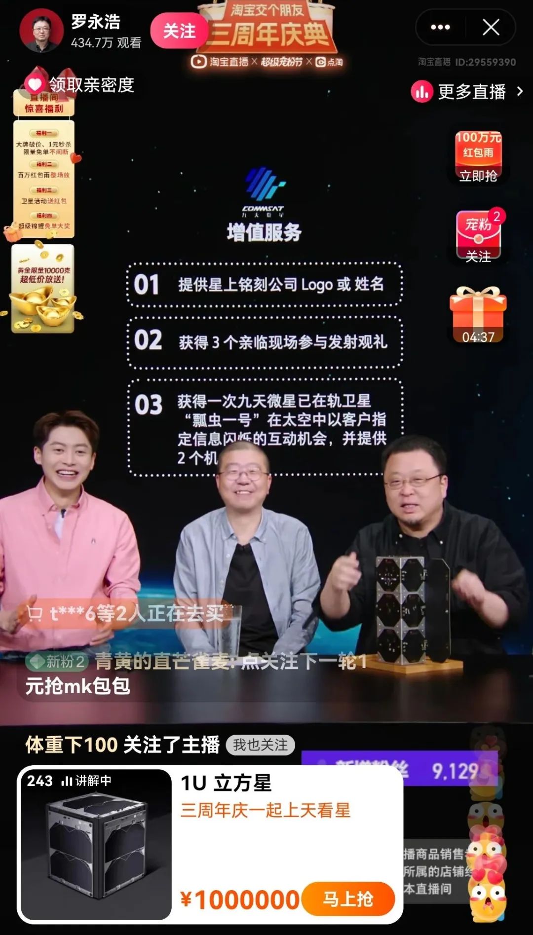 “第一,卫星同时是比较新奇有意思的产品,除了日常带货,交个朋友想给消费者带来更新奇特的产品;第二,我们想联合卫星公司开启商业化路径,让大家都能低成本参与,同时在淘宝上探索更大的货品空间。”崔东升告诉《天下网商》。