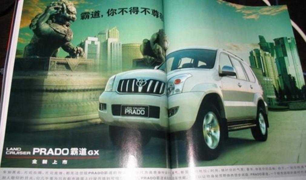 2003年,《汽车之友》第12期杂志发布了关于丰田霸道汽车的广告:一辆霸道汽车停在两个石狮子之前,其中一只举起右爪做敬礼状,另一只向下俯首,背景为高楼大厦,并配广告语“霸道,你不得不尊敬”。一些读者认为,该广告中的场景为卢沟桥上的狮子,丰田此举有明显辱华用意。