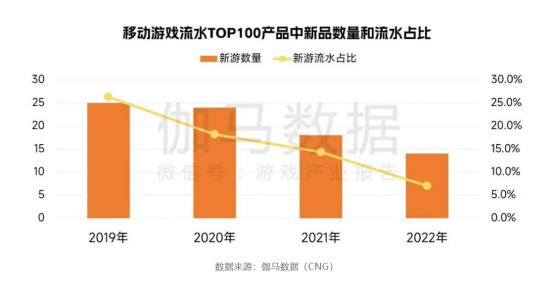 2022年有14款新游戏进入流水TOP100移动游戏名单,其流水占TOP100产品总流水的比例为7.0%,创下最近4年新低。自2019年以来,中国移动游戏流水TOP100产品中当年新品的数量持续下降,新品在TOP100产品中的流水占比也快速降低。