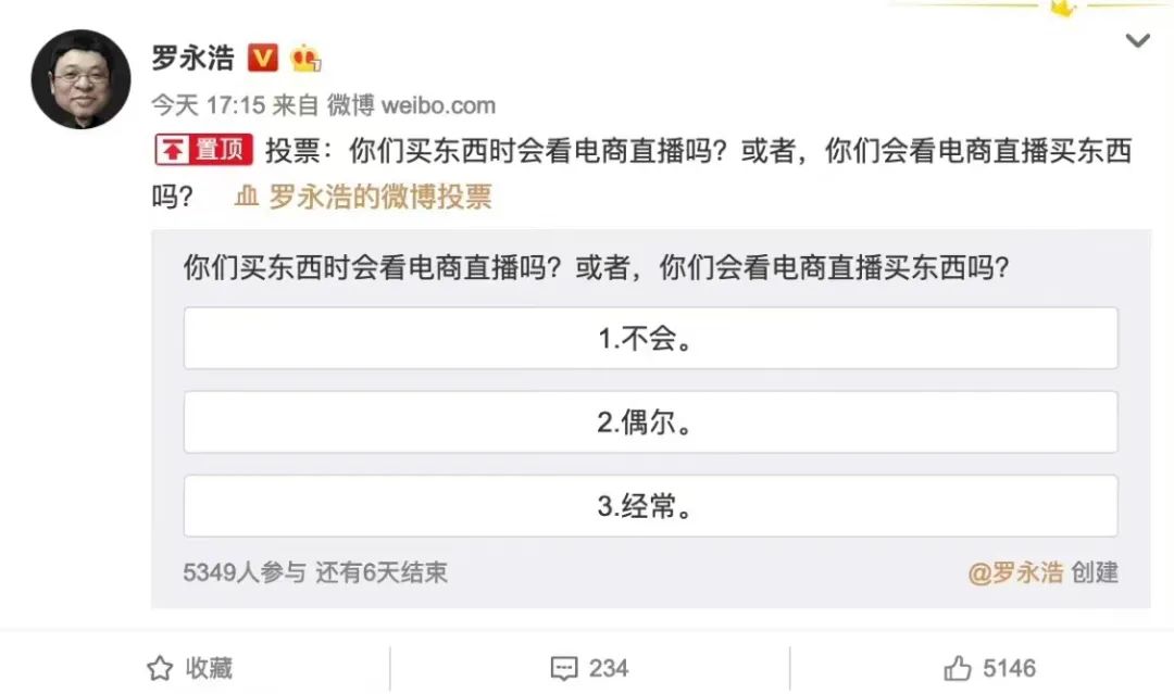 2020年2月21日,罗永浩在微博发起了一则投票,投票的内容是:“你们买东西的时候会看电商直播吗?或者,你们会看电商直播买东西吗?”3.7万人参与投票后,有2.6万人给出了“不会”的答案。