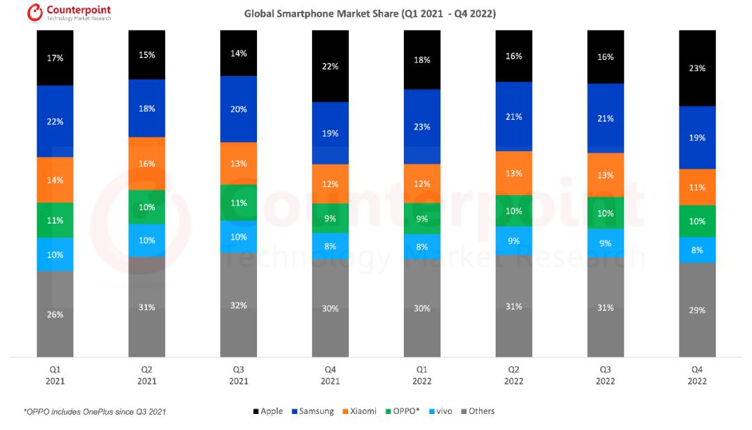 苹果智能手机出货量去年四季度再次反超三星,成全球第一 图源:Counterpoint