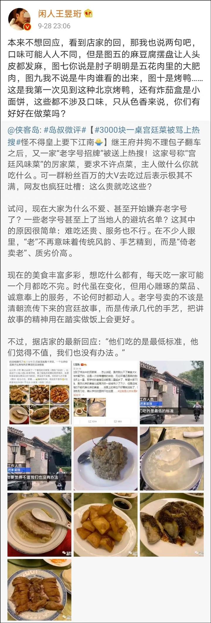 比如厉家菜,作为曾经的清宫宫廷府邸菜,很多人来到北京都想尝尝皇帝吃的家常菜到底是什么味道。然而2020年曾有微博大V发文吐槽,3000元一桌的套餐,上来之后个个像是黑暗料理,不仅没有网传的精致摆盘,而且味道也完全不尽如人意。