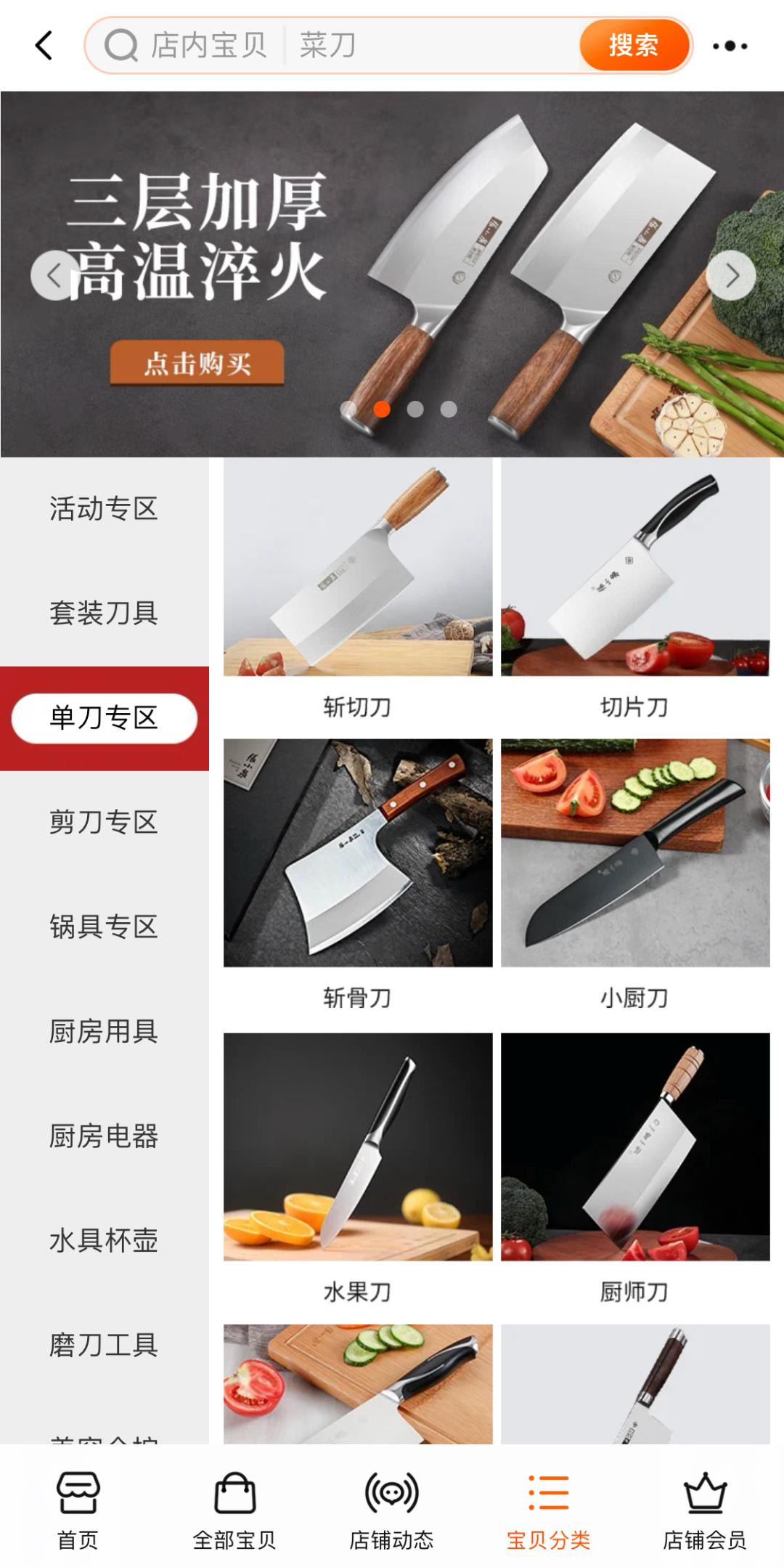 如果不是这位消费者,估计一些厨房小白甚至都不知道,现在菜刀分类已经这么细致了。打开张小泉旗舰店,里面关于刀的分类十分细致,斩骨刀、切片刀、斩切刀......不同刀型甚至还有不同的材质可以选择,让人看了眼花缭乱。