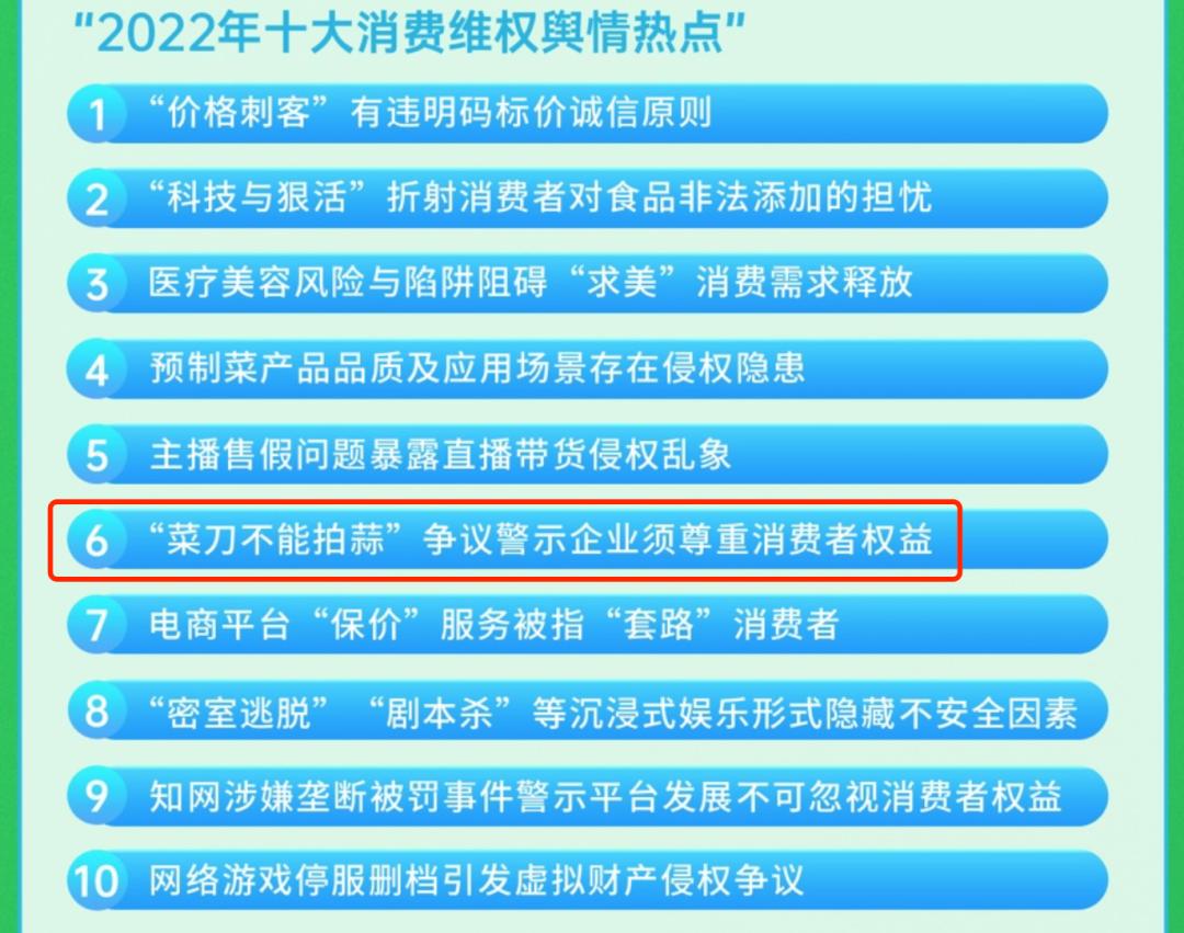 到了2023年1月,因为连续的断刀事件,张小泉的“菜刀不能拍蒜争议”甚至还上榜了中国消费者协会公布的“2022年度十大消费维权舆情热点”。消费者协会认为,作为老字号传统品牌,张小泉在事件中的回应,实在是很难让消费者理解,警示企业需要尊重消费者合法权益。