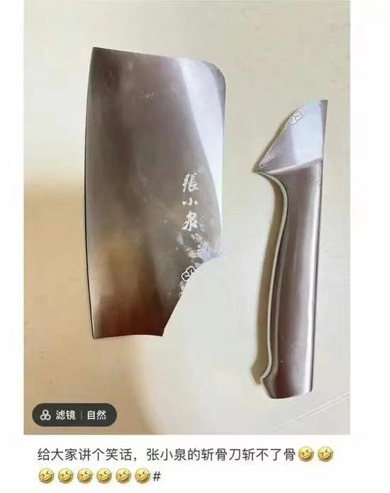 张小泉又断了。3月26日,一位消费者发文称“给大家讲个笑话,张小泉的斩骨刀斩不了骨”,配图是从刀身处完全断裂的一把张小泉斩骨刀。