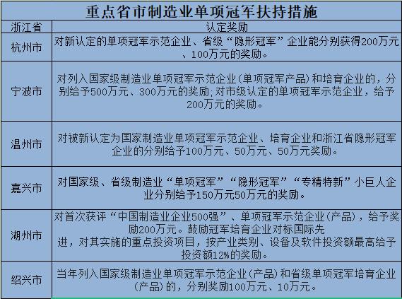 最“土豪”的深圳市,对国家级单项冠军企业的奖励是300万,而宁波对列入国家级单项冠军企业和培育企业,分别奖励500万元和300万元;对市级单项冠军,奖励200万元。