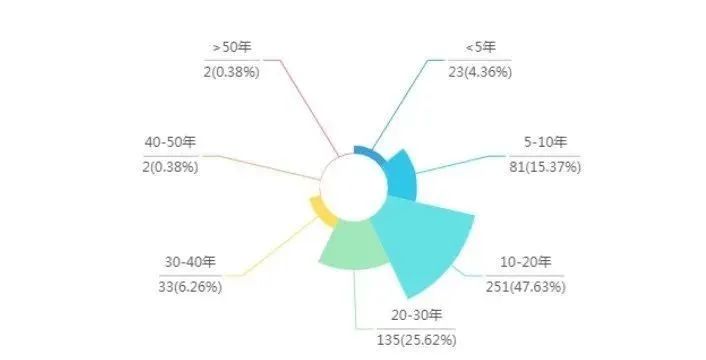 其中,10~20年的企业数为181家,占比为47.14%;20~30年的企业数为99家,占比为25.78%;超过40年的企业有4家,其中有2家企业从事主营产品年份已超过50年。
