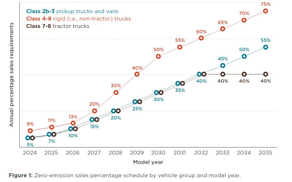 作为背景,加州空气资源委员会(CARB)正在推进明年落地多项中、重型卡车的减排新规。其中先进清洁卡车(ACT)法案要求汽车生厂商在2024至2035年期间,持续提高零排放重卡的销售额比例。