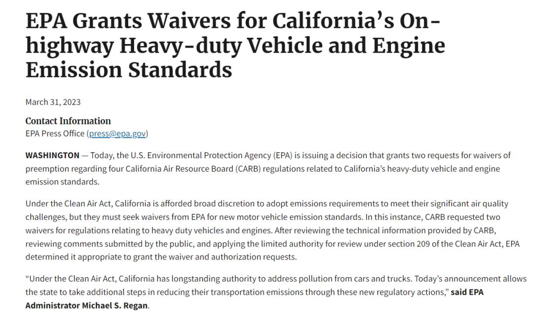 虽然加州只是美国的一个州,但该地区的GDP超过3万亿美元,略低于欧洲经济龙头德国,等同于全球第五大经济体。同时加州在立法层面通常会走在前沿,一些新举措也会随着时间普及到联邦政府层面,特别是在民主党执掌白宫时期。由于加州对于中、重型卡车零排放(电动化)的规则比联邦政府更加严格,所以需要得到拜登政府的授权。