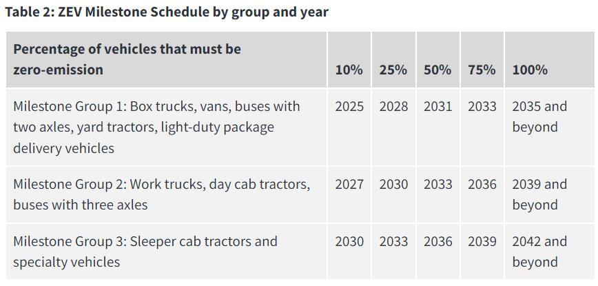 而在先进清洁车队法案中,加州的车队们可以选择从2024年开始只够买零排放卡车,或者选择按照不同类型的车辆满足零排放车辆百分比的要求。例如电动巴士、轻型货车的车队需要在2035年满足100%零排放,而垃圾车、拖拉机拖车、水泥搅拌车等重型卡车的车队也需要在2035年底前达到75%的零排车辆配置。