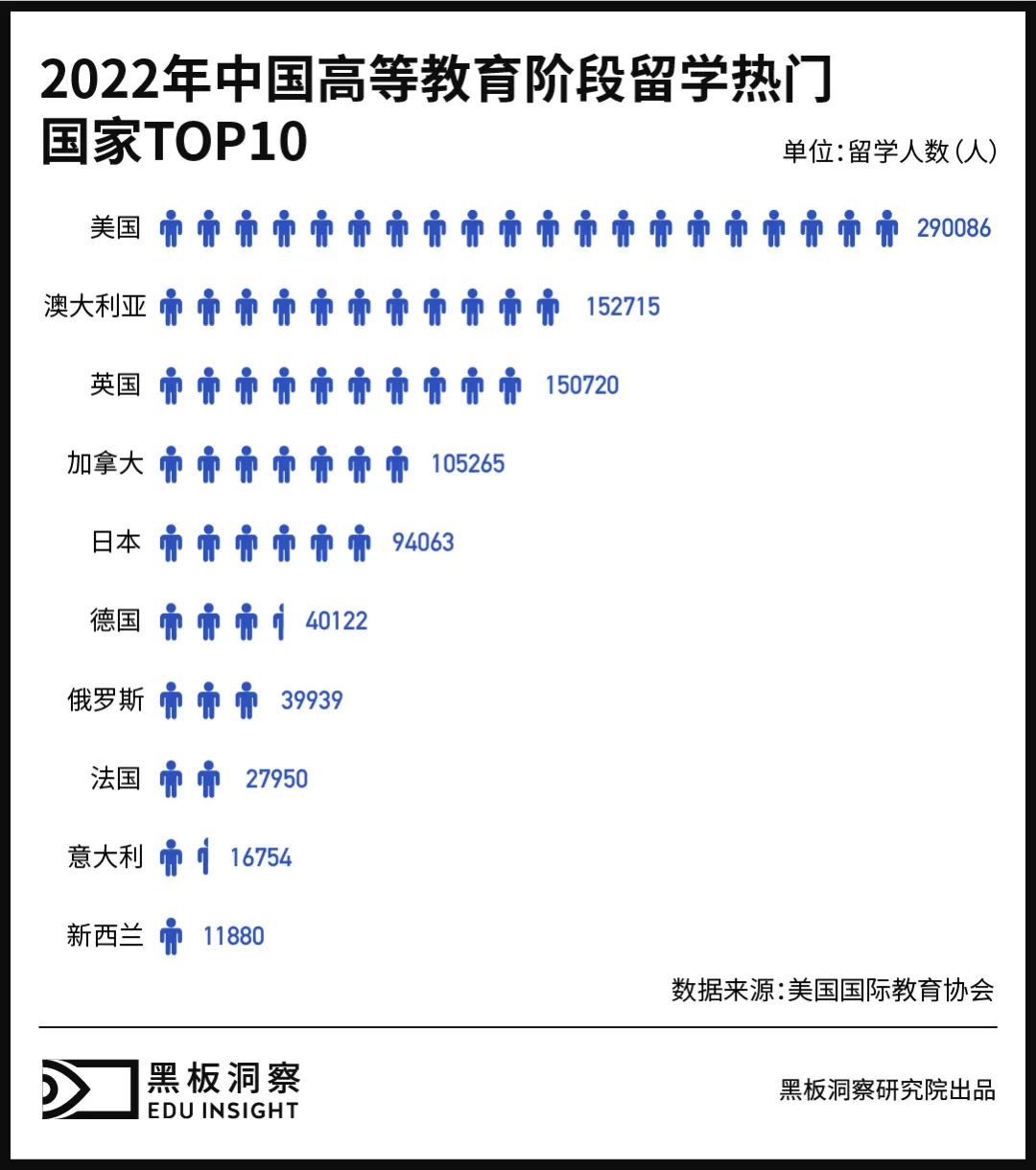 另据美国国际教育协会不完全统计,2022 年高等教育阶段我国留学生人数较多的国家中,排行前十的分别是美国、澳大利亚、英国、加拿大、日本、德国、俄罗斯、法国、意大利及新西兰,其中在美留学生已接近 30 万人,英国和澳大利亚也有超过 15 万人。