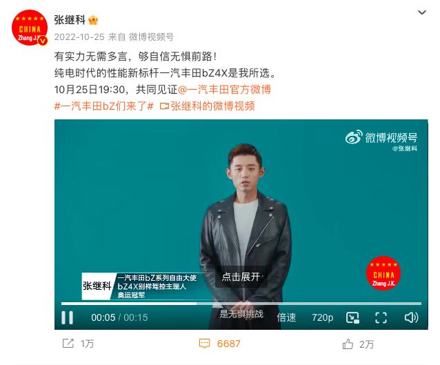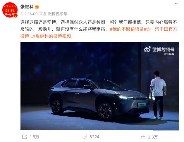 就在一个月前的3月2号,张继科还发布了与bz4x相关的宣传微博,并@了一汽丰田官方。