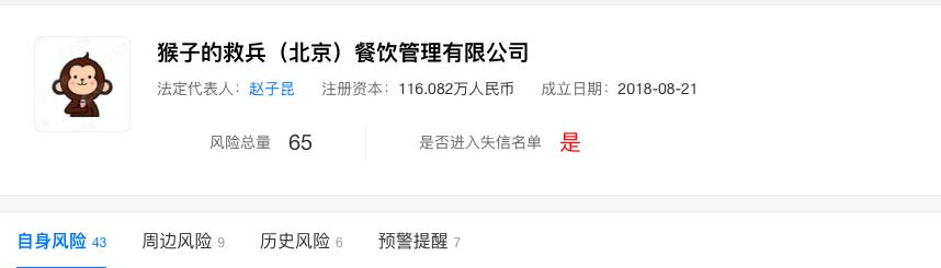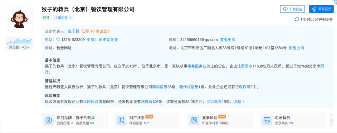 天眼查显示,“猴子的救兵”隶属于猴子的救兵(北京)餐饮管理有限公司,最早成立于2018年8月,注册资本116.08万人民币,法定代表人、疑似实控人均为赵子昆。